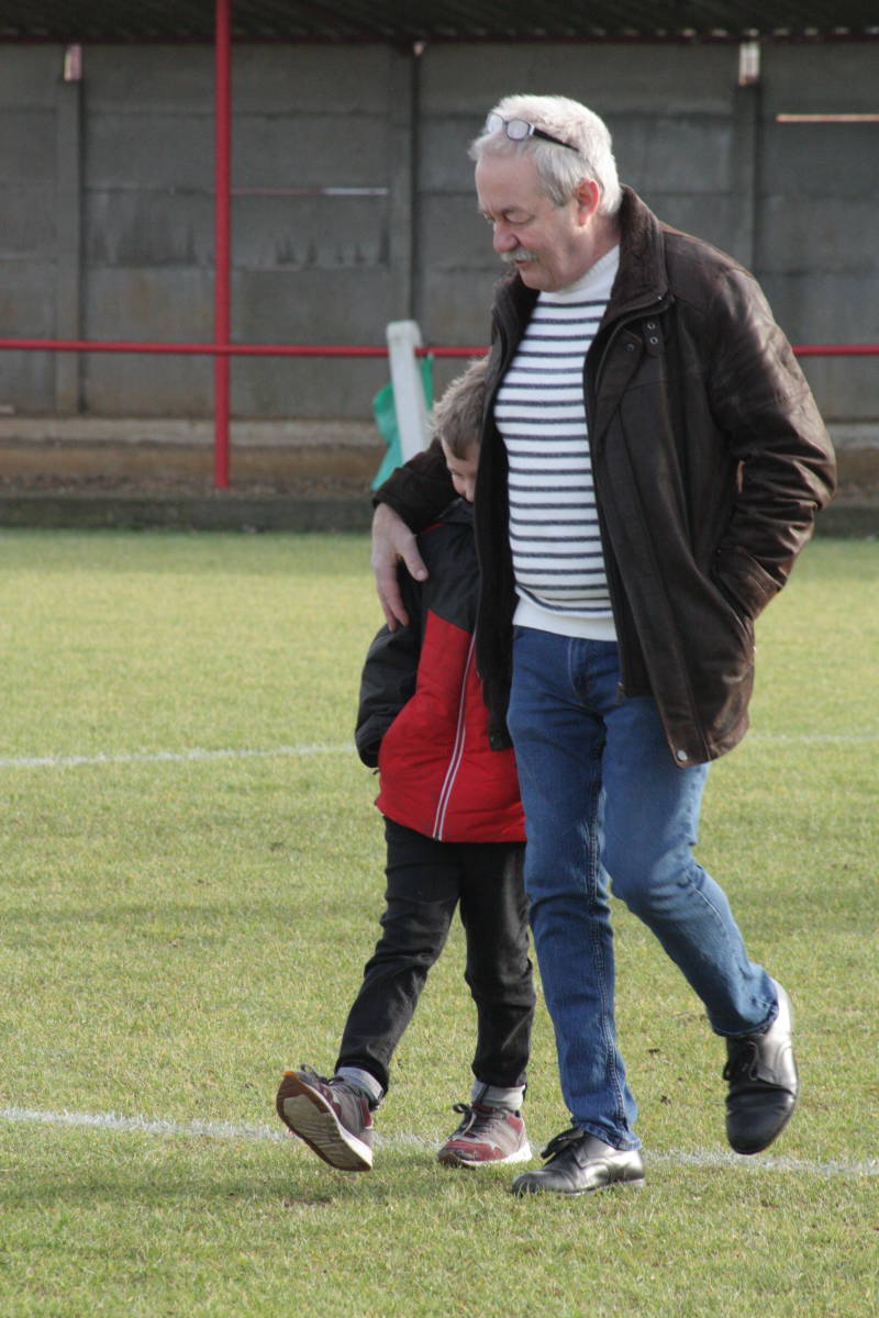 Balsponsor café De Bierpot uit Schriek schonk voor deze match de bal en gaf samen met kleinzoon Hayden, speler bij U9, de aftrap